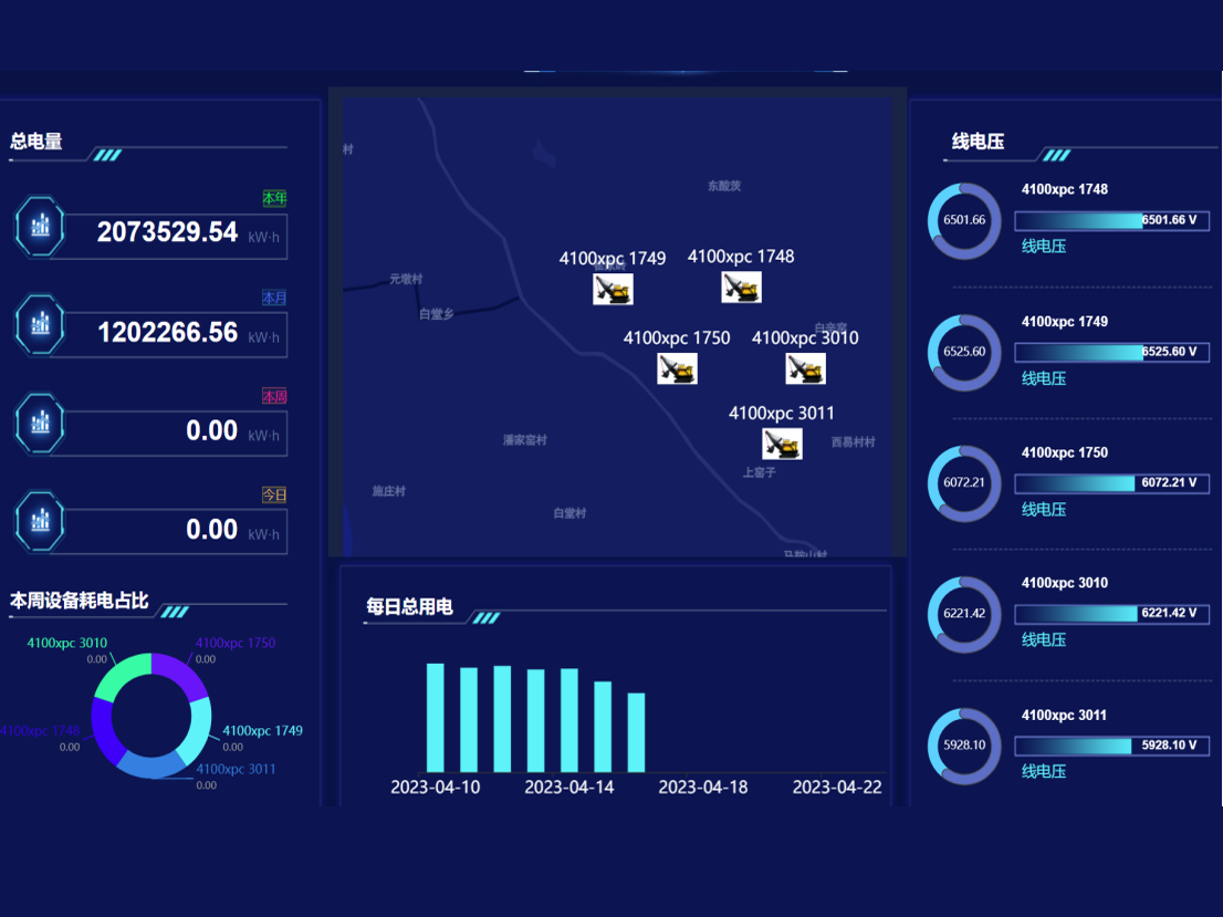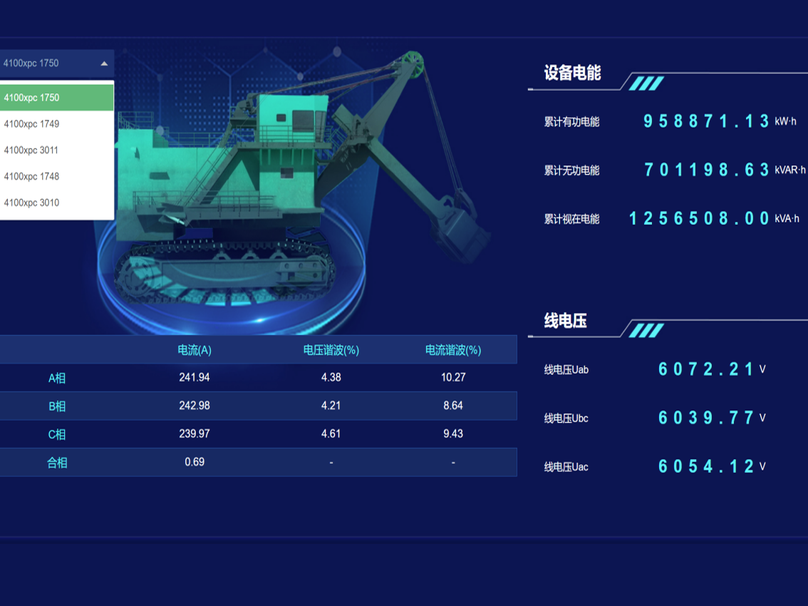 数据接收与能源管理平台要求可对电能数据进行全面管理,可随时随地将电铲功率、电能、电压、电流等数据进行集中展示,并可根据用户需求输出电铲的能耗统计报表;用户可通过平台实时掌握设备的电能消耗情况,实时掌握各个台班电量的消耗,进行数据统计与分析,并进行有计划的供电安排及设备停机、检修等事宜。平台可同时管理一个用户现场的多台设备。