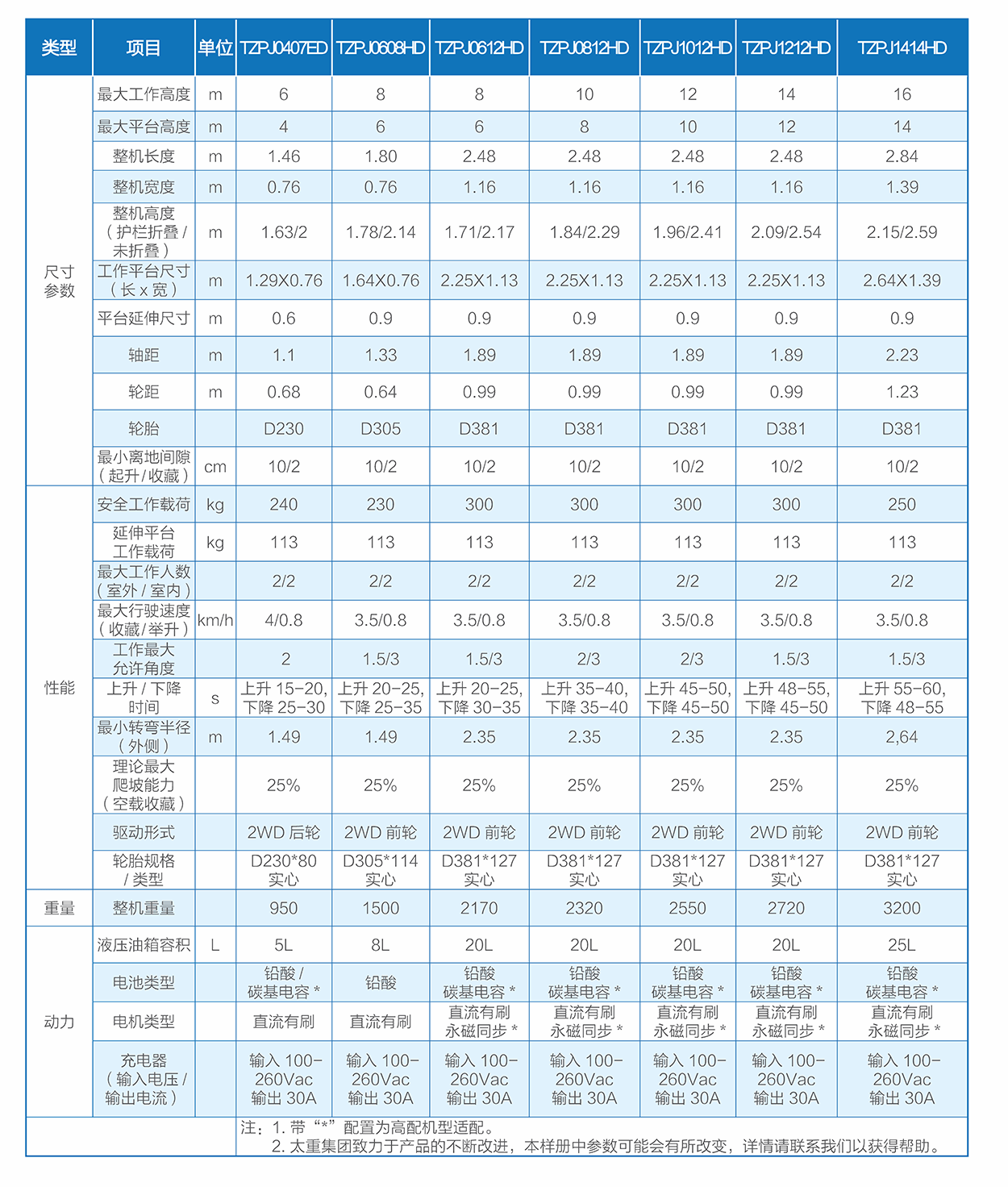 市场主力机型的底架、单节叉臂和平台总成均为通用的、可互换的,具有全行程行走、无痕轮胎、4×2驱动、紧急下降、紧急停止、故障诊断、倾斜保护、坑洞保护、安全检修支撑杆、充电保护、标准运输叉车孔等功能。