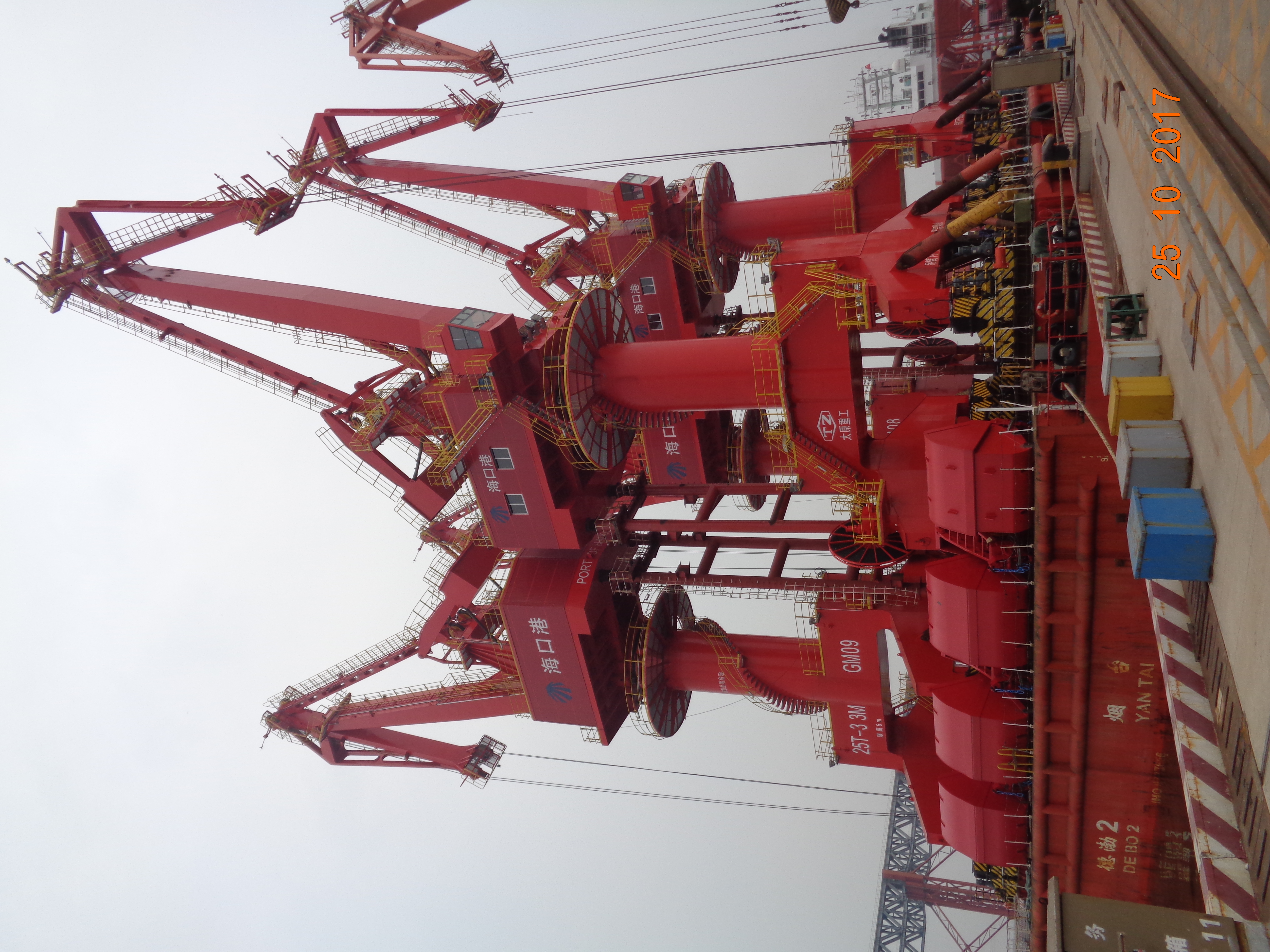 门座起重机是装在沿地面轨道行走的门型底座上的全回转臂架起重机,是码头前沿的通用起重机之一。可以通过滚装发运的方式成套向客户提供所需的门座起重机,包括:四连杆门座起重机、单臂架门座起重机、固定的带斗门机。