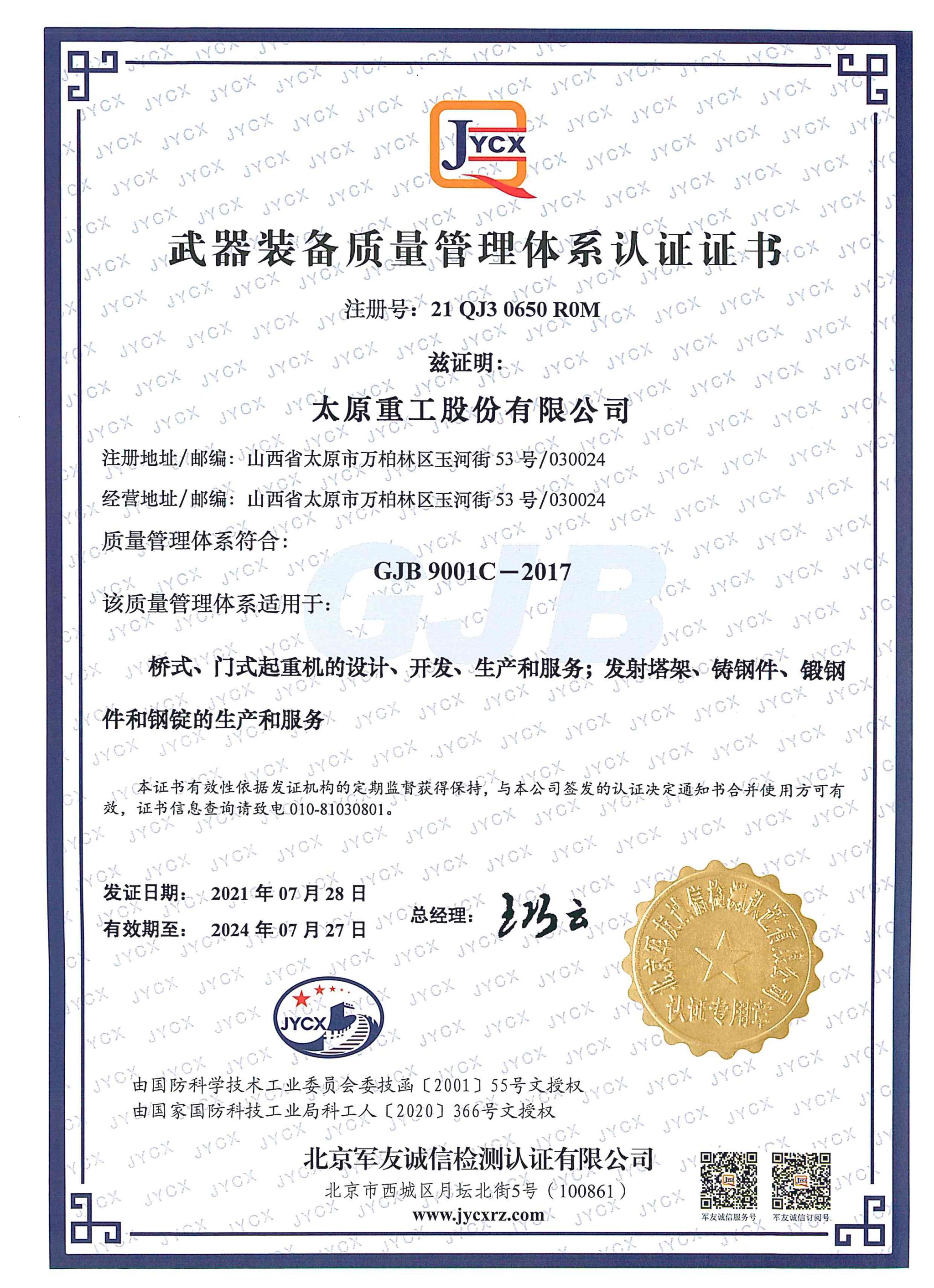 在执行ISO9001标准的基础上,太重积极推广应用可靠性管理、卓越绩效管理等先进管理方法、加强质量激励和质量改进力度,结合产品特点不断建立健全个性化的质量管理体系,通过实施“质量管理体系认证+可靠性管理体系认证”,打造质量管理体系升级版。太重荣获了多项质量管理荣誉:
