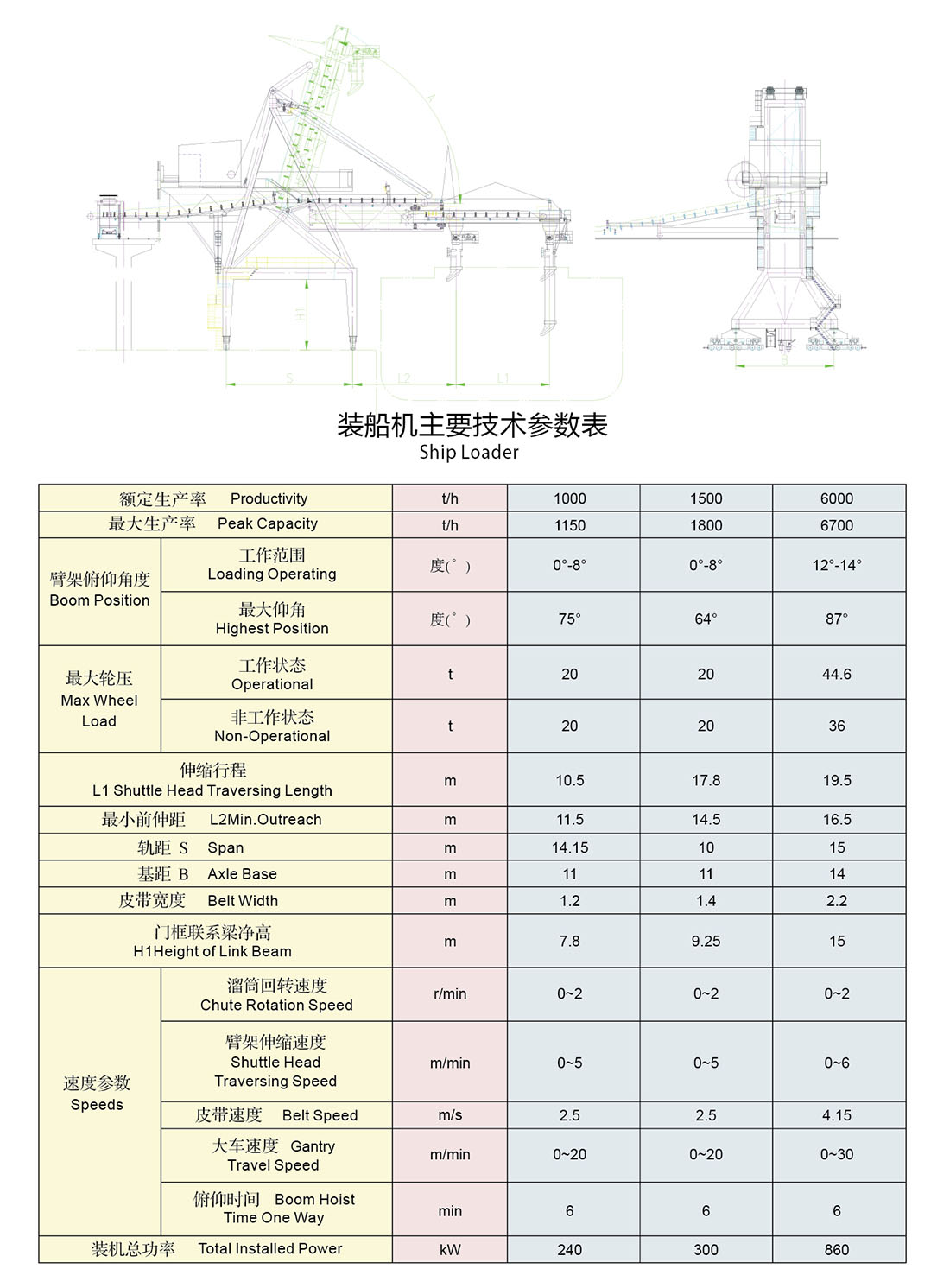 装船机用于大宗散货装船作业的连续式机械,与后方输送机系统相衔接。以悬臂带式输送机为主体,由带式输送机及其他工作机构(回转、变幅、伸缩、运行)和机架组成。